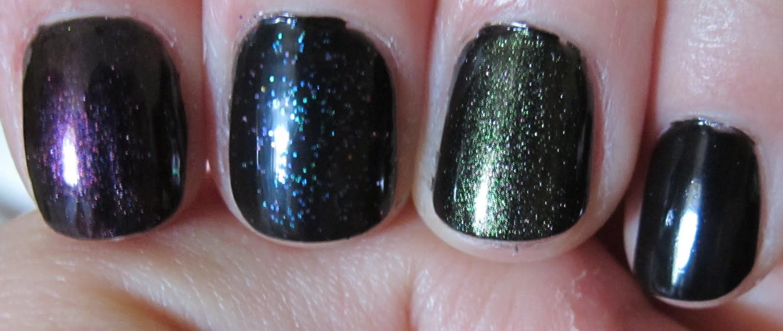 Two coats for these pictures, and it was prone to brush-stroke marks. The formula is very thin, and it took a while to dry. *sigh* pretty colour, but a PITA to work with.